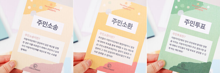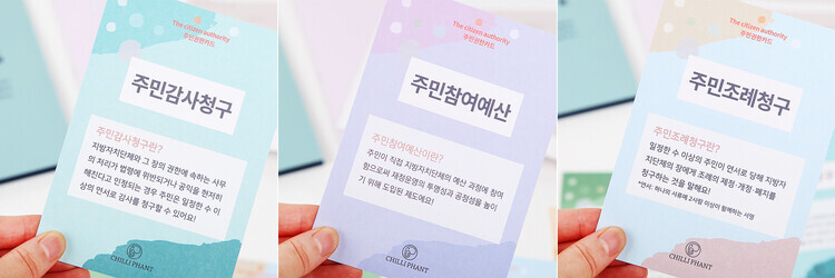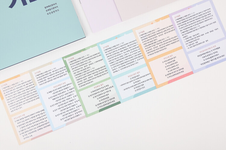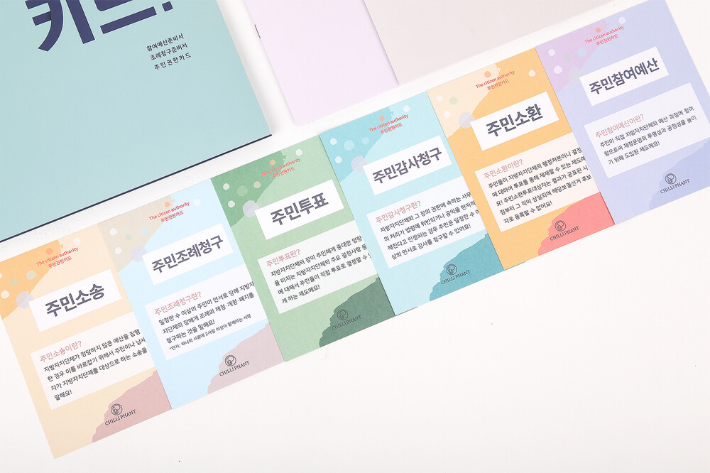 익숙한 제도도 있고, 조금 생소한 제도도 있을거에요. 6가지 '주민권한카드'는 앞면에는 제도의 간략한 소개를, 뒷면에는 근거 법령과 주요 내용을 요약해서 넣었어요. 필요할 때마다 꺼내서 찾아보면 되니까 무슨 제도가 있는지만 먼저 확인해보세요~!