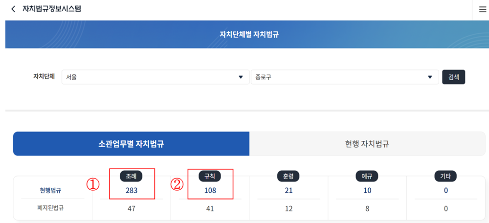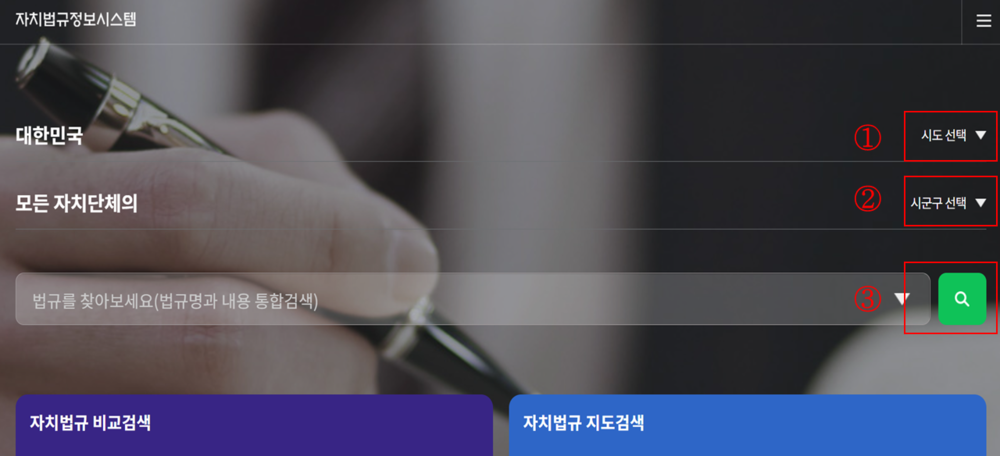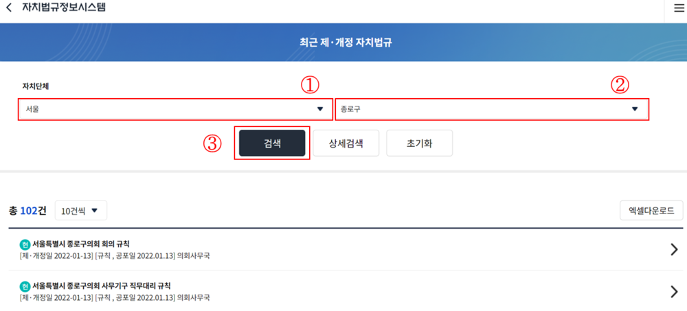 자치법규정보시스템 > 메인 > 상단의 시도, 시군구 선택 > 검색 버튼