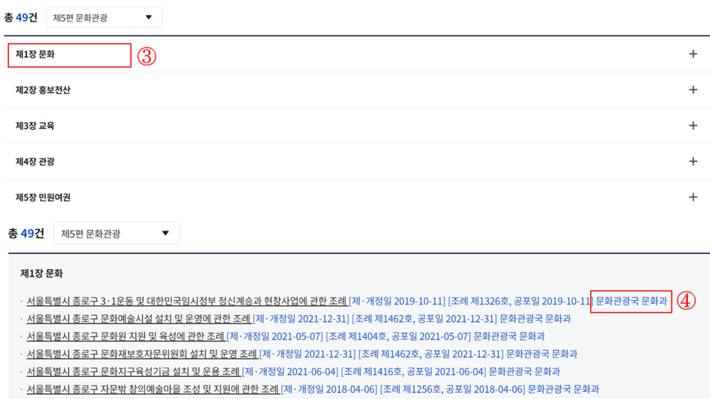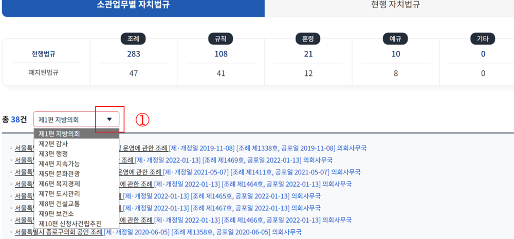 자치법규정보시스템 > 메인 > 상단의 시도, 시군구 선택 > 검색 버튼 > 숨은목차 클릭 > 관심있는 '편' 선택 > 관심있는 '장' 선택 > 소관부서 확인 가능