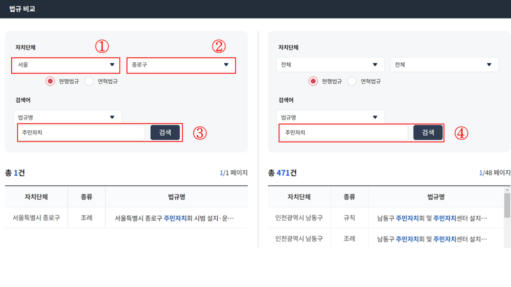 자치법규정보시스템 > 메인 > 자치법규 비교검색 > 지역선택 > 관심 법규 검색어 선택