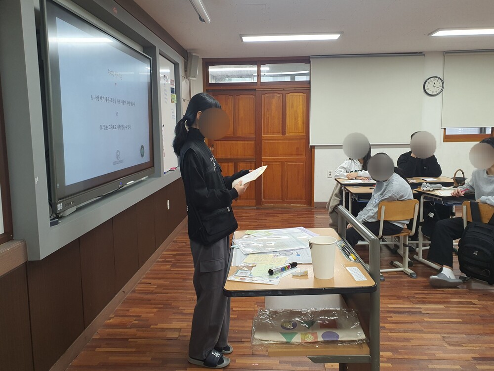 정리가 끝나면 각조의 듣정님들은 모두 앞으로 나와 우리 조의 주장을 발표합니다.