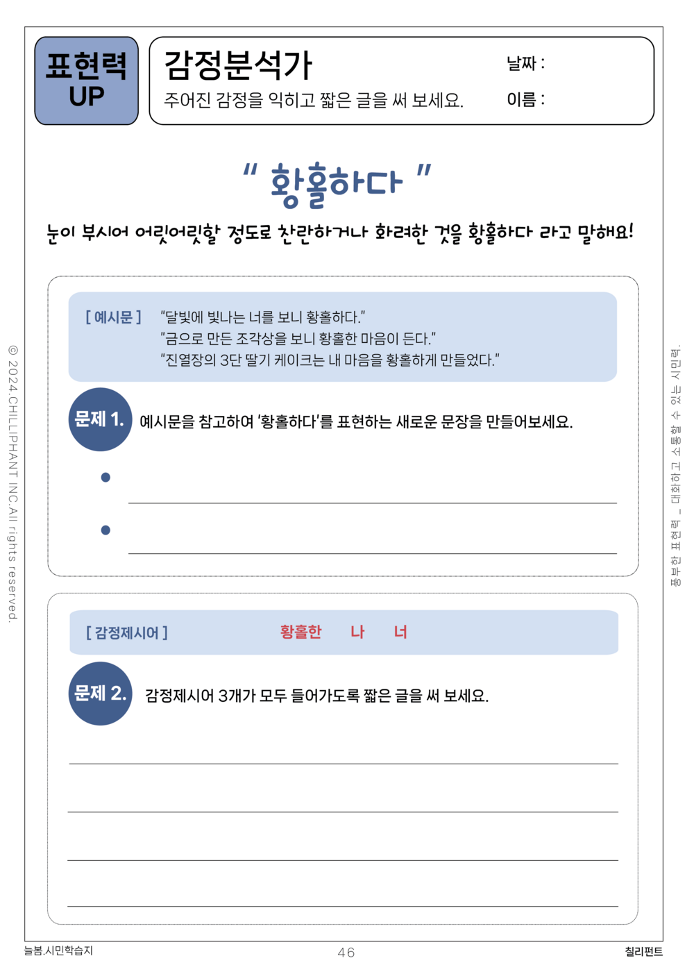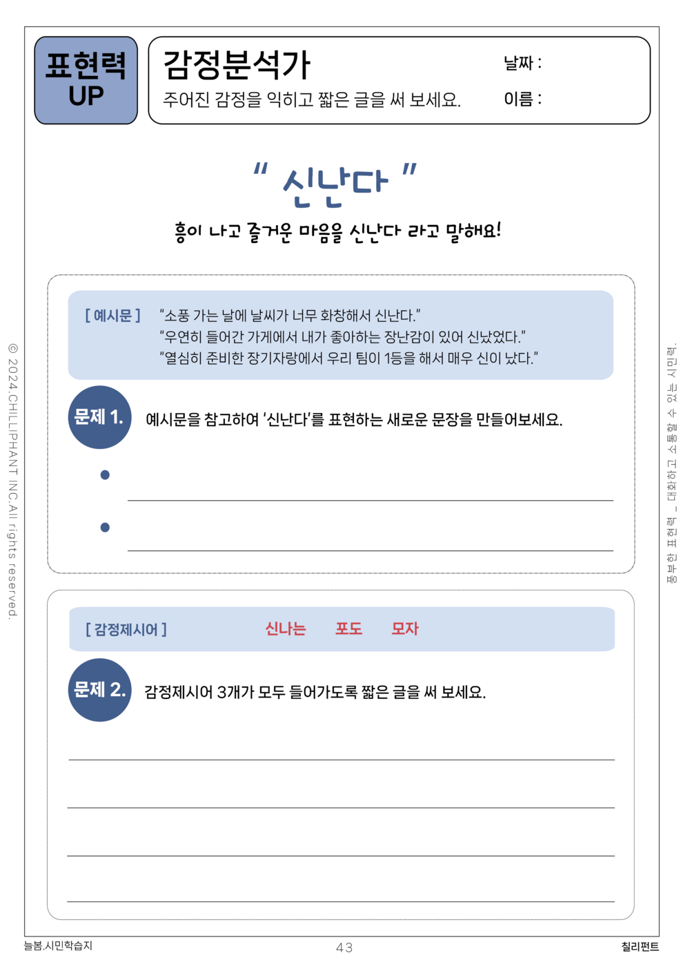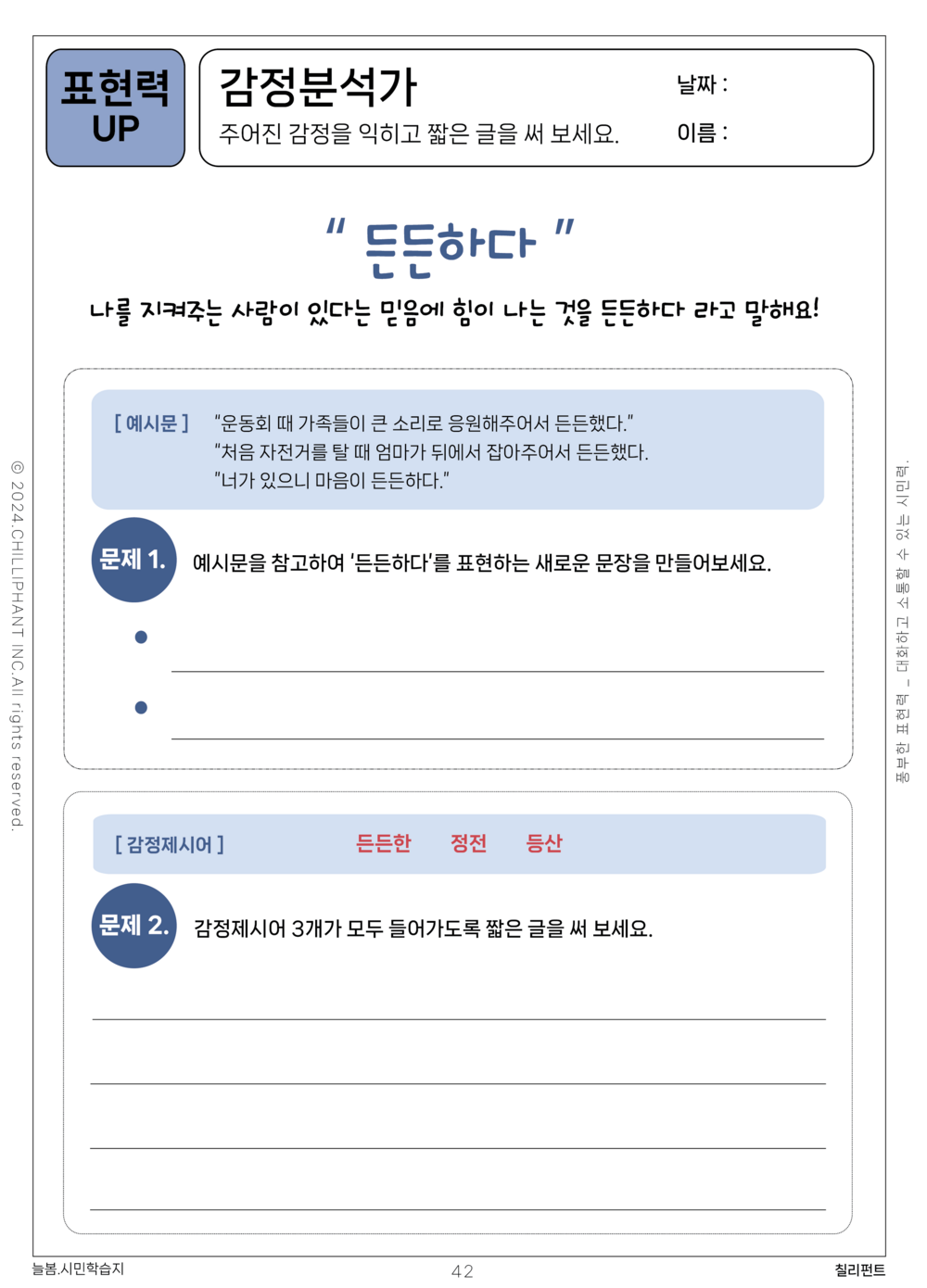 감정LIST : 기대되다, 든든하다, 신난다, 자신있다, 평화롭다, 황홀하다, 괴롭다, 미안하다, 속상하다, 안타깝다, 좌절하다, 걱정되다, 당황하다, 불안하다, 무관심하다, 싸늘하다, 곤란하다, 답답하다, 억울하다, 지긋지긋하다