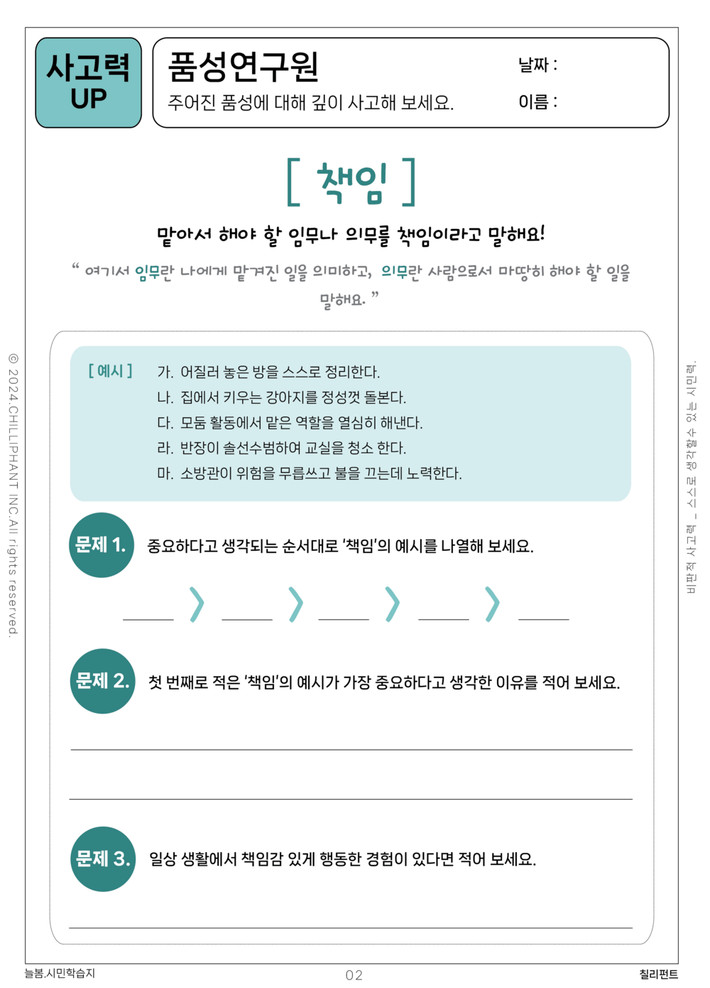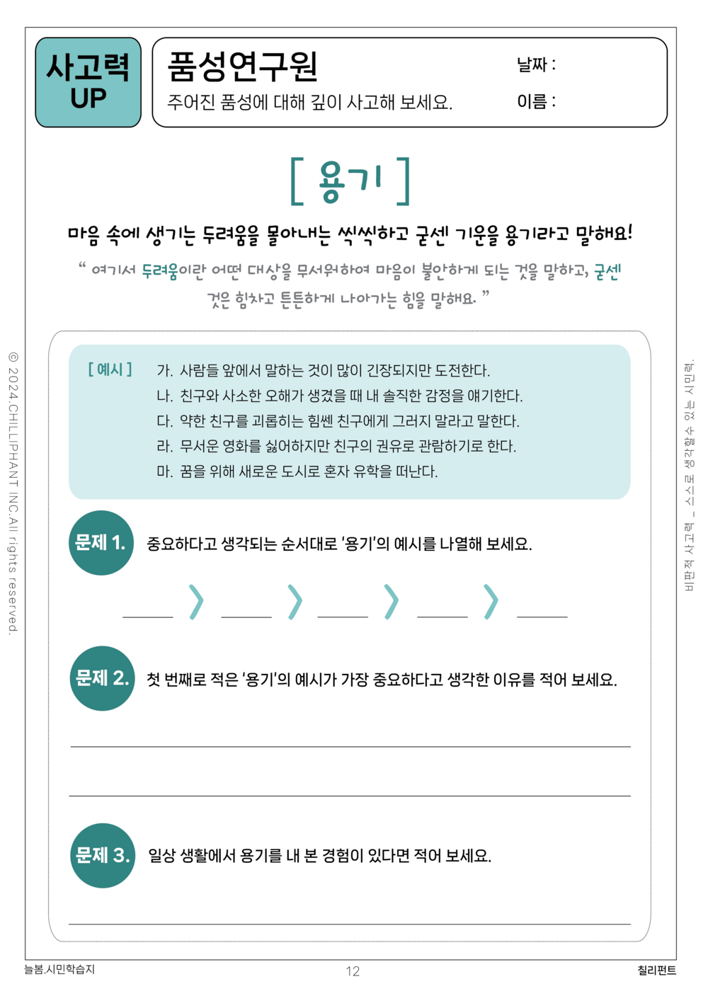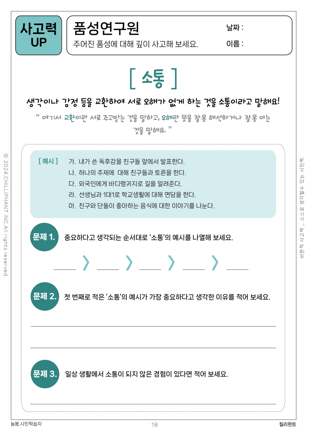 품성LIST : 공정, 책임, 정직, 겸손, 예의, 협력, 공감, 친절, 배려, 이해, 용서, 용기, 성실, 끈기, 인내, 긍정, 신뢰, 소통, 자제, 낭비