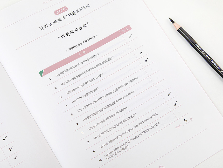 나의 강화능력을 체크하는 단계입니다. 1단계 체크결과로 나온 나의 기본유형에 해당하는 계절을 제외한 3가지 계절에 대해 체크합니다. 각각 10개의 문항이 있고 해당하는 항목에 대해 체크하면 됩니다. <설득력 : 공감소통능력>, <지도력 : 비전제시능력>, <조정력 : 조직관리능력>, <설계력 : 전략수립능력> 중 하나의 능력이 나의 강화능력이 됩니다.
