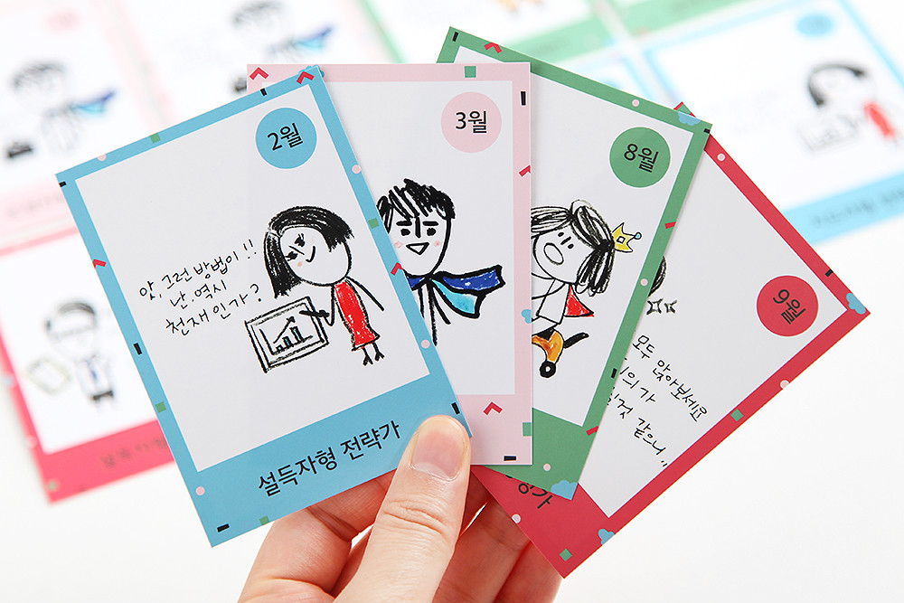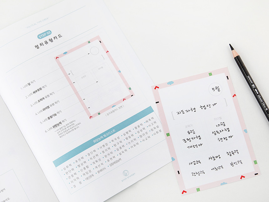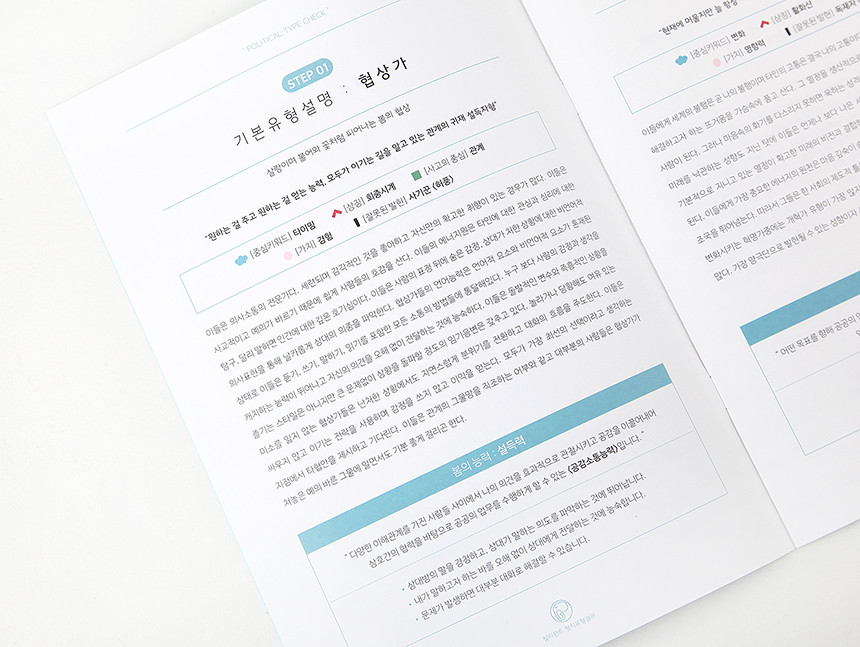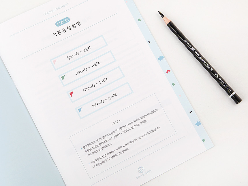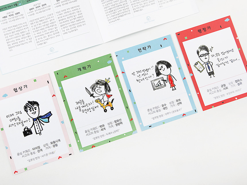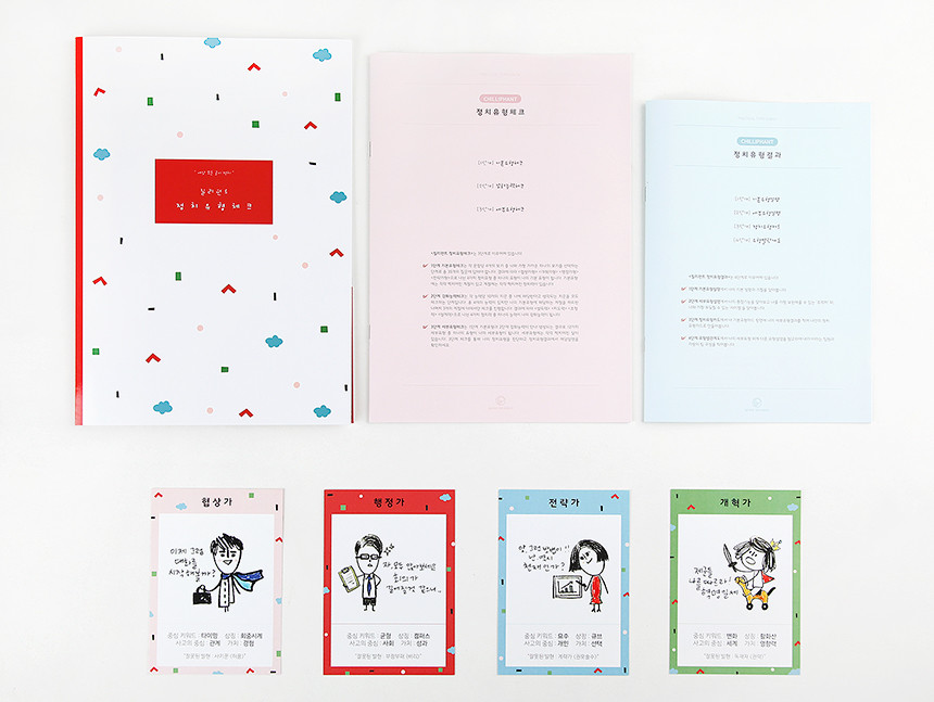 키트에 포함되어있는 정치유형카드 4장 중에서 나의 유형에 해당하는 카드 뒷면에 나의 대한 설명을 적어보세요. 나만의 캐릭터카드가 되어 나를 소개할 때도 내가 다시 볼 때에도 편하게 사용하실 수 있어요. 4가지 기본유형에게 있는 귀여운 캐릭터도 꼭 확인해 보세요~!