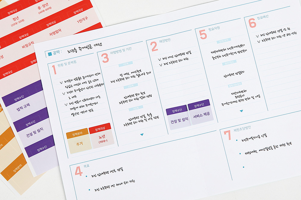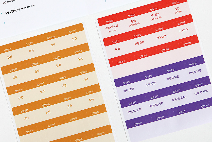 정책개발스티커는 '정책분야' '정책대상' '정책수단'이 예시로 들어있는 스티커입니다.
