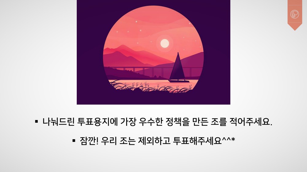 정책발표 후에는 가장 좋은 정책을 만든 조를 뽑는 정책투표 시간을 갖습니다.